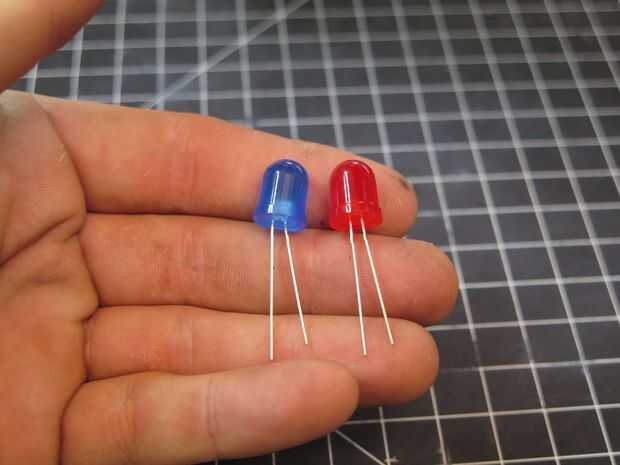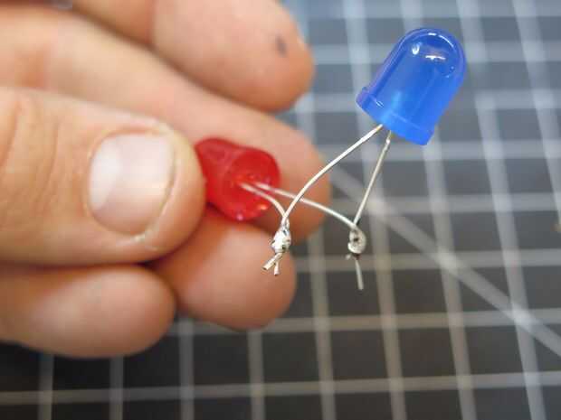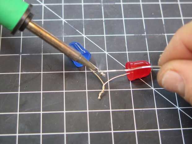 Echa un vistazo a tu LED difusa y las piernas en un determinado LED son diferentes longitudes. El más largo es el ánodo (+) y el más corto es el cátodo (-). Hasta y les de la soldadura que el ánodo de uno esté en contacto con el cátodo del otro. O mejor dicho, la pata larga de uno está tocando la pata corta del otro.
