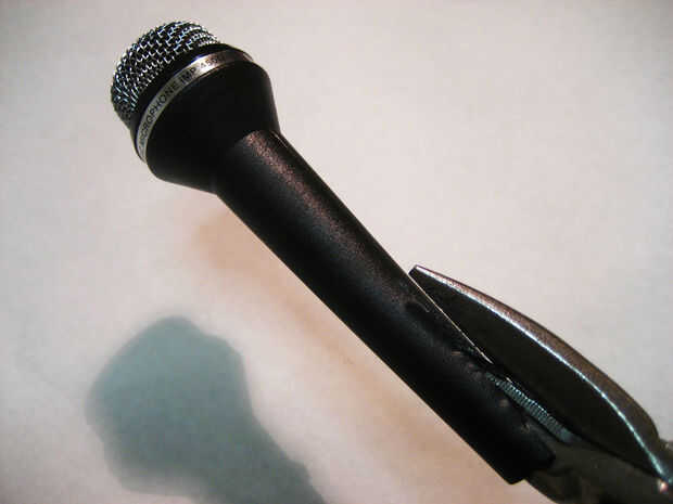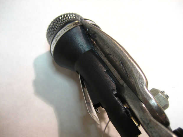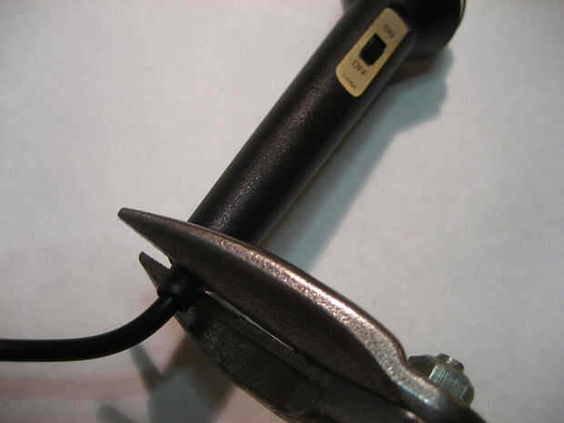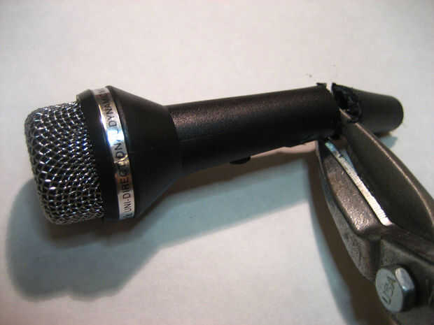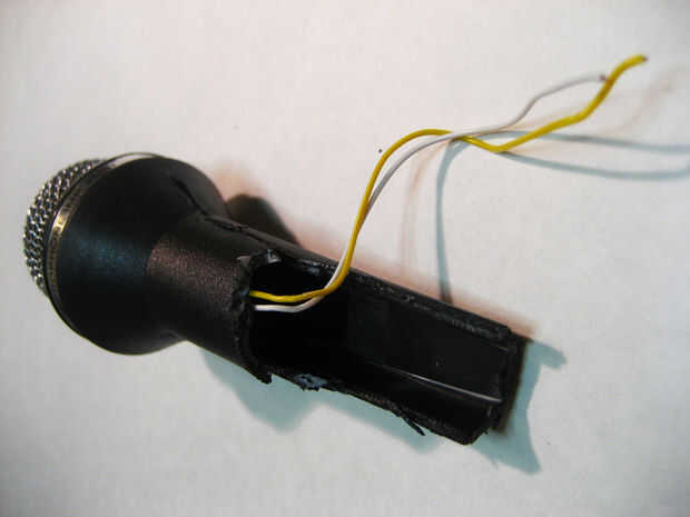 2. ahora que se retira el extremo del micrófono, meter la punta de una de las cuchillas de recorte de estaño en el extremo abierto del micrófono y empezar a cortar a lo largo de la cara. (cuadro #4)