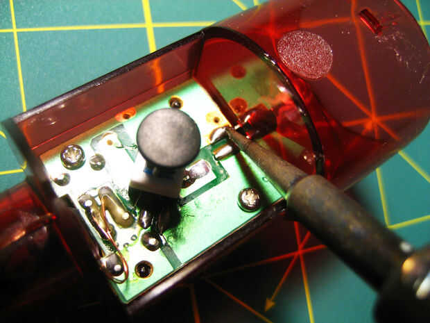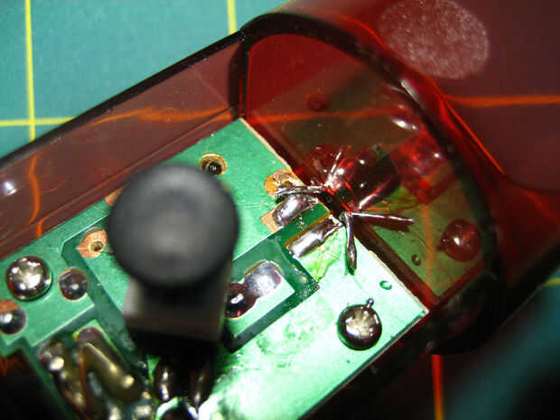 2. Utilice su cortador de alambre para cortar las patas del LED apagado y retire el LED de la parte superior de la linterna. (imagen #2)