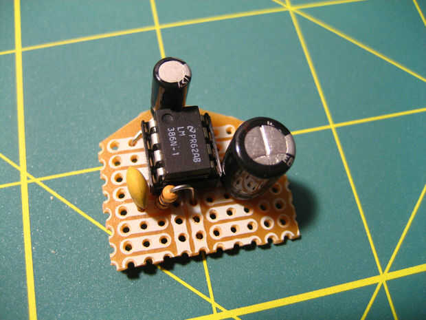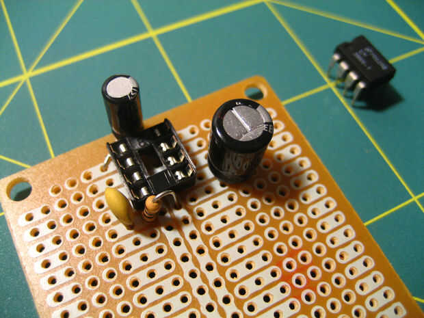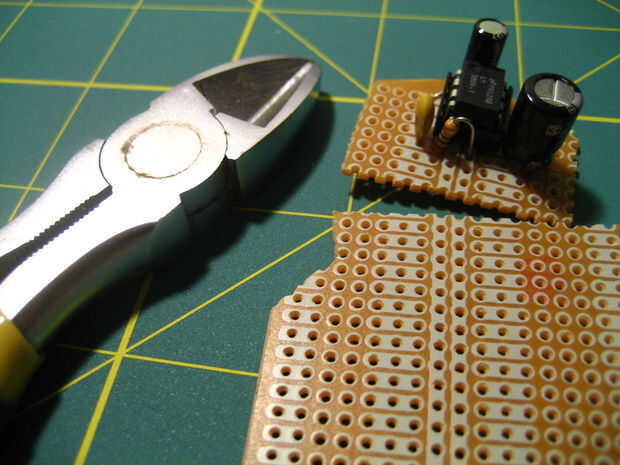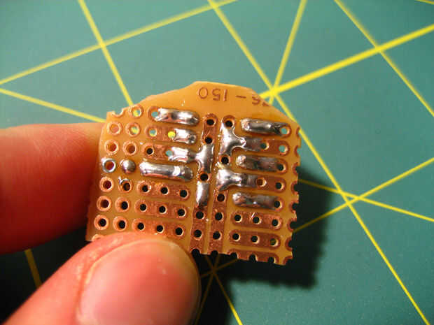 3. usando un alambre de corte, alicates, tijeras o incluso las manos, rompen el tablero de PC extra dejando sobre 1 o 2 agujeros de un margen alrededor de su circuito. (fotos #4 y #5)