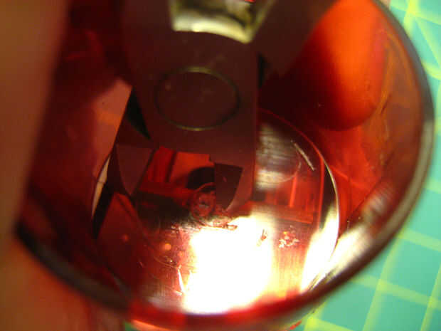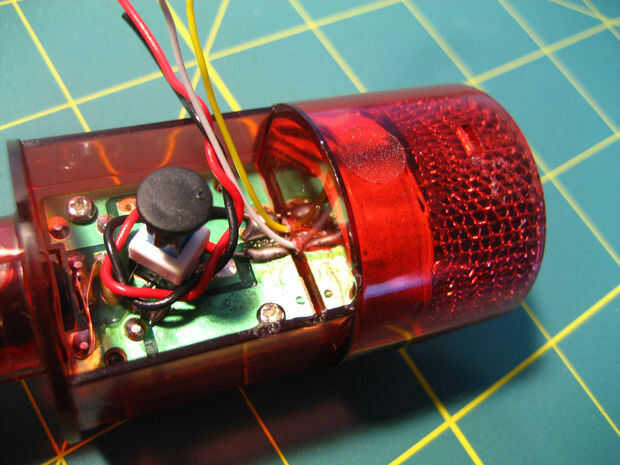 6. en primer lugar, envuelva sus cables rojo y negro en el interruptor del empuje de linterna para conseguirlo fuera del camino. En segundo lugar, pase los cables blancos y amarillos del micrófono a través de los agujeros viejos de LED. No importa cual cable va por que agujero. Por último, apriete con cuidado los lados de la malla metálica hacia el interior con el fin de que el micrófono se ajuste en la parte superior de la linterna. Tenga cuidado de no lastimar los dedos como la malla metálica puede tener bordes muy afilados. (cuadro #7)