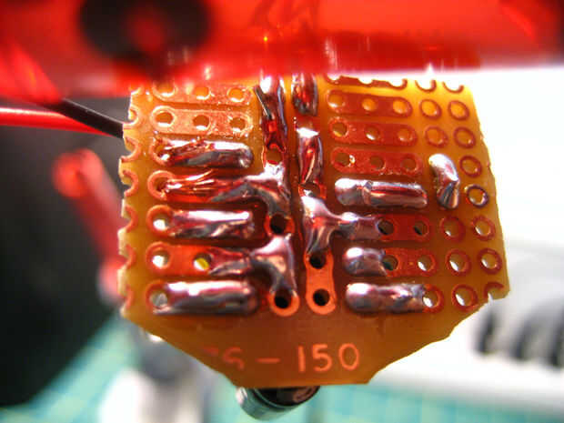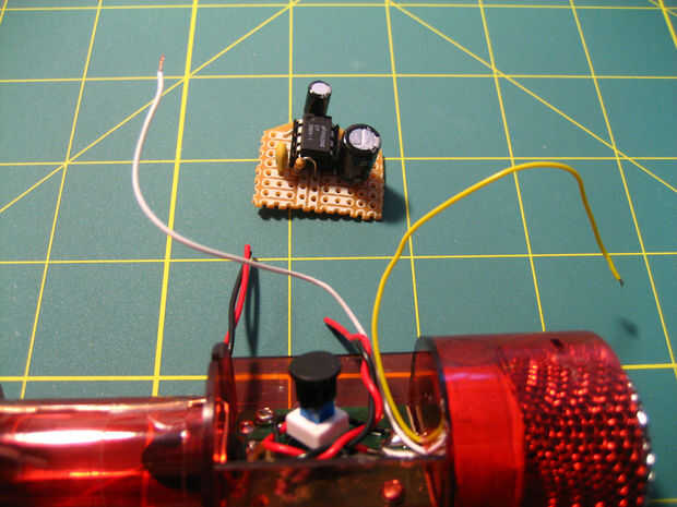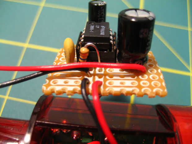 10. Conecte el cable rojo de la linterna de la sacudida en el riel de alimentación en el circuito y conecte el cable de tierra negro de la linterna de la sacudida para el carril de tierra en el circuito. En la parte posterior de la placa de circuito con el pin 1 y 8 del IC hacia delante, el tren de potencia está a la izquierda en el centro y el carril de tierra está a la derecha. Soldar los cables en su lugar. (cuadro #13)