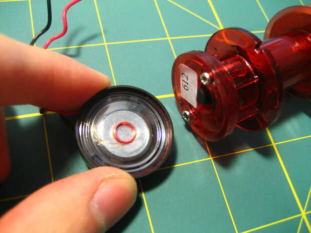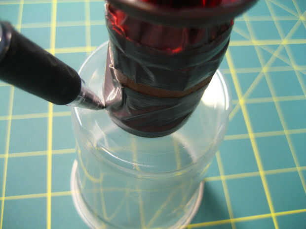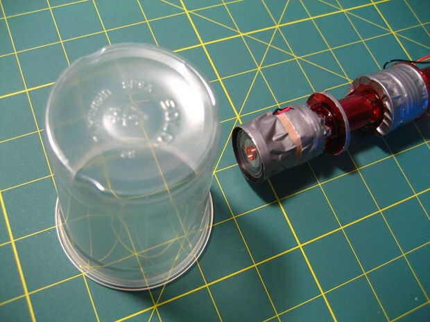 13. Tome el vaso de plástico y coloque la parte superior hacia abajo. Ponga el extremo del altavoz de la linterna en la parte inferior de la taza y usar una pluma para trazar el altavoz. (cuadro #20)