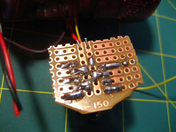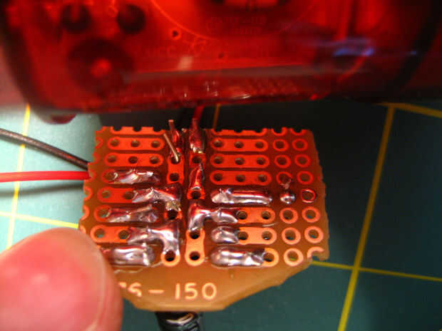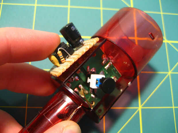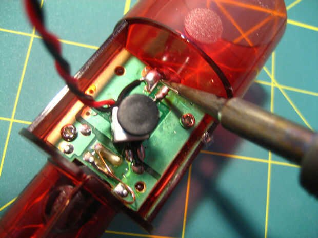 2. Sostenga la placa de circuito que previamente realizado sobre el lado de la linterna, como se muestra en la imagen siguiente, para tener una idea de cuánto tiempo los cables serán necesario. Ahora agregaremos los cables desde donde el viejo LED utiliza para la placa de circuito. Cerca de 4 pulgadas de alambre negro y rojo hará probablemente, aunque siempre es mejor tener exceso. (imagen #2)