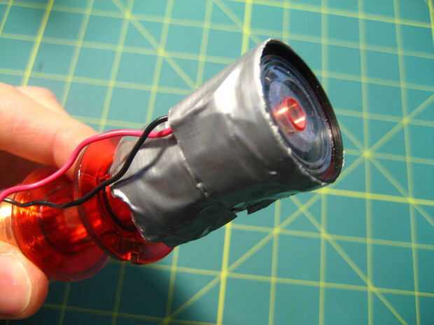 8. usando cinta aislante cinta o pato, coloque el altavoz en la parte inferior de la linterna. Prefiero la cinta aislante porque tiende a mirar mucho mejor, pero en este caso, sólo tenía pato cinta disponible. (cuadro #10)