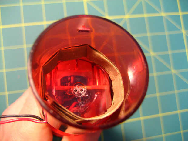 5. Envuelva la tira de cartulina alrededor de tu pulgar para doblar en forma y pegarlo en el extremo de la linterna. (cuadro #6)