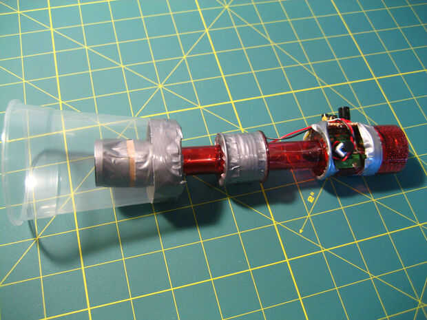 15. para el último paso, use cinta eléctrica o cinta pato para sujetar el vaso de plástico a la cresta plástico justo encima del altavoz. (cuadro #21)