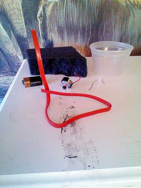 1 Motor rumble (puede encontrarse en los controladores de juegos de azar) 2 hilos, largo (sólo se muestra en la imagen 1 batería de 9 voltios cualquier espuma compresible un envase (terminé usando una lata con su tapa de corte)