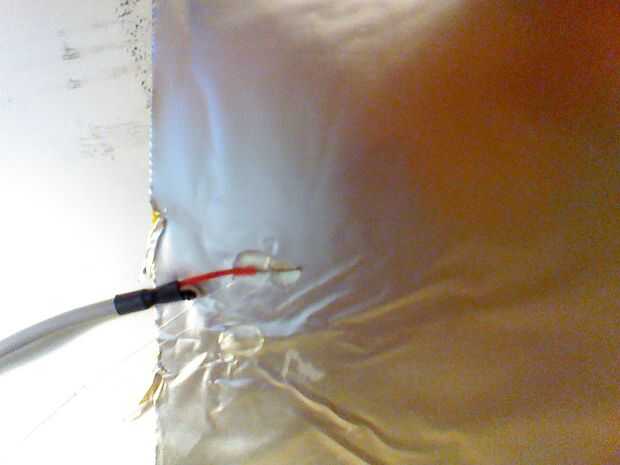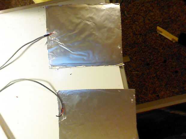 Pegamento caliente los dos extremos de los cables de un extremo de los cuadrados del lado del frustrado lata. Asegúrese de que el cable toca el papel de aluminio esto es muy importante!