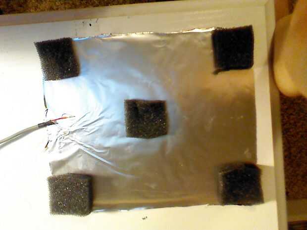 pegamento caliente pequeños trozos de espuma (aproximadamente un cuarto de pulgada de espesor) para las esquinas y el centro como tal. Esto es para agregar espacio deformable entre las placas