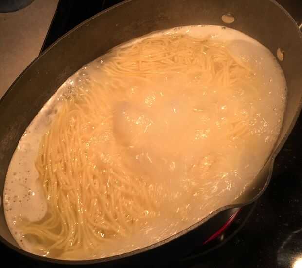Cocinar la pasta hasta al dente, unos 4 minutos para mis espaguetis caseros, o pasta fresca. (Siga las instrucciones del paquete).