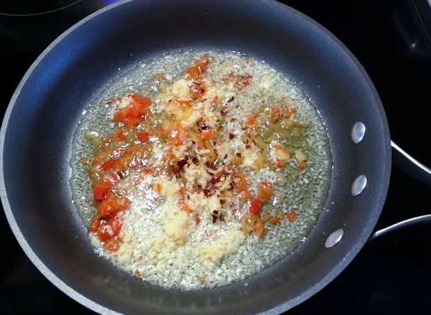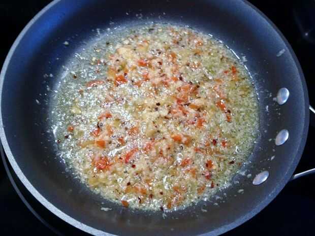 Calor 3 cucharadas aceite de oliva en una sartén mediana a fuego bajo. Añadir el ajo, escamas del Chile, pimientos en vinagre y pimienta negra. Cocinar suavemente hasta que el ajo se ablanda y vuelve ligeramente dorado, revolviendo de vez en cuando, unos 8 minutos.