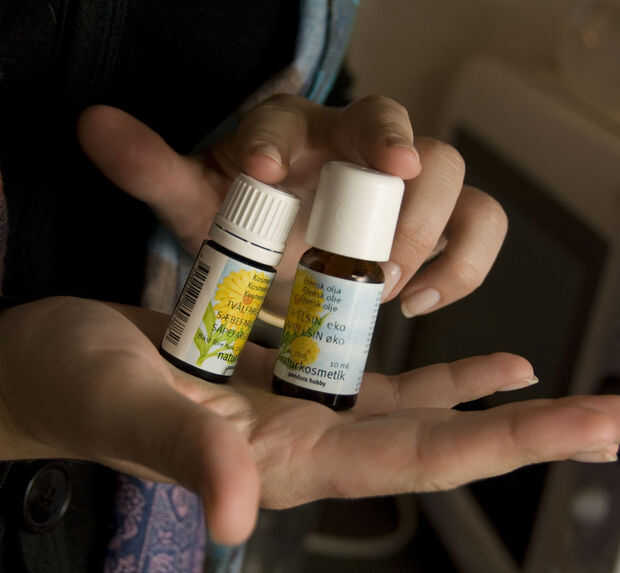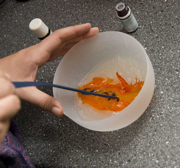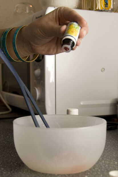 3: Añadir el aceite esencial. Debe tener un olor algo fuerte, como lo será, a diferencia del color, ser humedecido con cuando se mezcla con la gelatina.