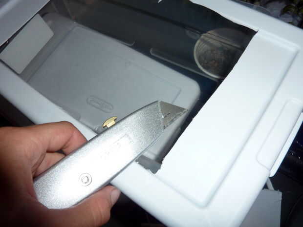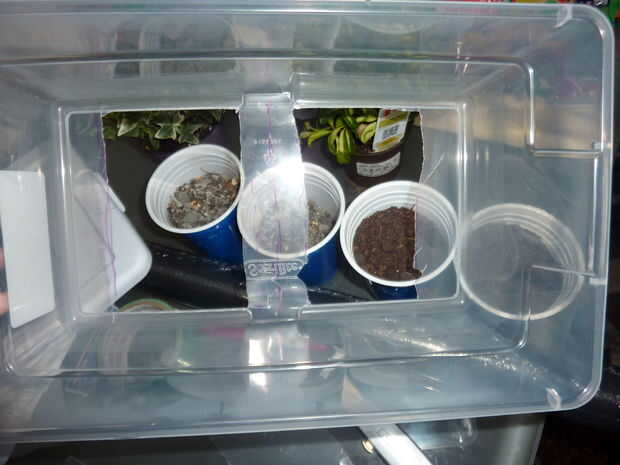 Necesita hacer agujeros en una tapa y la parte inferior de uno de los contenedores. El envase se utilizará para el plantador y será la tapa de un contenedor separado que el estiércol vegetal del interior de la casa, utilizar un cuchillo de boxcutter si tienes uno. Puede utilizar tijeras, pero los agujeros pueden terminar imprecisa.
