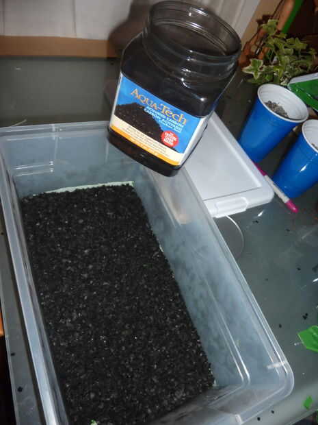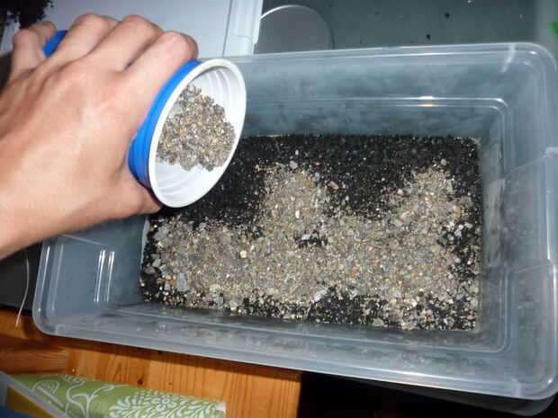 La segunda capa es de arena, guijarros o gravas (o una mezcla de cualquiera de estos materiales). Si grava o guijarros, desea asegurarse de que las piedras individuales no son demasiado grandes, no más grande que una uña (no incluyendo el pulgar). Esta filtración secundaria y ayuda a mantener el suelo en su lugar. Arena haría un mejor trabajo en la retención de agua que las otras opciones obviamente pero cuenta con la salvedad de también ser más pesado, una vez mojado (cuando usted riegue sus plantas). 1,25 o tan solo tazas de material fue suficiente para hacer una capa de la mezcla de grava pequeña encontré localmente.