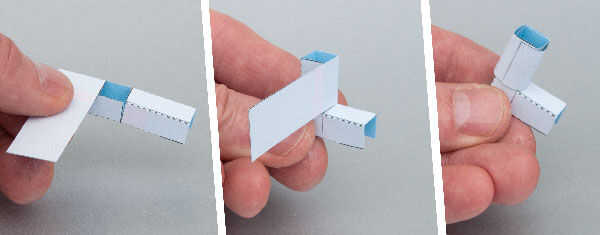 Montar el mango en tres pasos. Doblar las dos secciones cuadradas. Pegue una sección en la otra. Rodillo redondo y pegar hacia abajo la lengüeta larga.