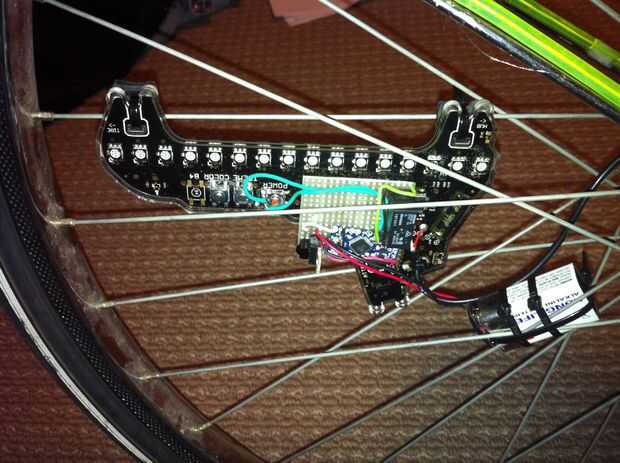 El paquete de baterías AA de la M232 actúa como un balance de la rueda a la placa de circuito. Ya que estamos agregando peso - sobre todo la batería de 9V - jugar a encontrar el punto dulce para equilibrar la rueda. Intente poner lo más cerca del centro como sea posible, o incluso en el centro.