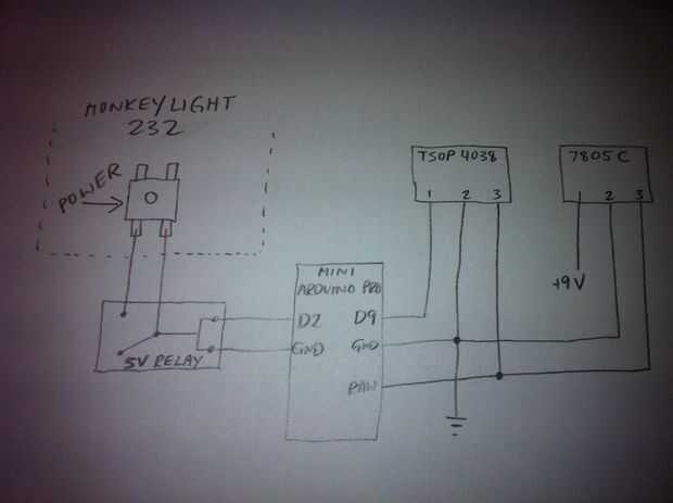 Intenté usar el paquete de baterías existentes de la M232 para alimentar este gack - con tres pilas AA proporcionan 4.5V - dentro de la gama de funcionamiento para el Arduino y el TSOP 4038. Y funcionó - bien, mitad-funciono: activa el relé para activar el M232, pero no activan el relé para apagar; el relé sólo haría un tenue "clic" - pensé que esto es debido a la corriente consumida por el circuito M232: es decir cuando las luces estén encendidas, hay insuficiente energía para activar el relé. Así que, decidí lanzar una batería de 9V con un regulador de voltaje en la mezcla. Ver el diagrama del circuito.
