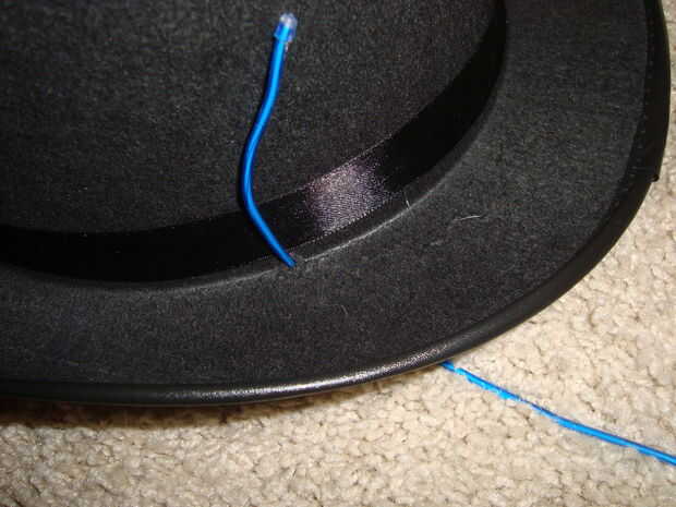 ¡ Vale, sacar la lezna (o podría usar un clavo) y hágale un agujero en la base del sombrero. (Ver imagen) Asegúrese de que el agujero es suficientemente grande para el alambre a quepa.