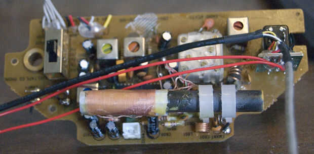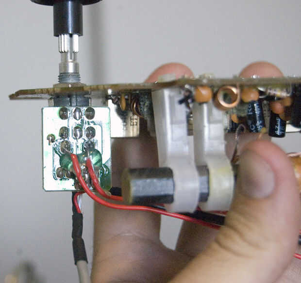 Esta es la tabla que tiene los controles en la parte delantera. La pieza que nos preocupa es la placa de circuito detrás de la perilla de control de volumen. La placa de circuito en la segunda foto es lo se se soldar nuestros cables y conector RCA a.