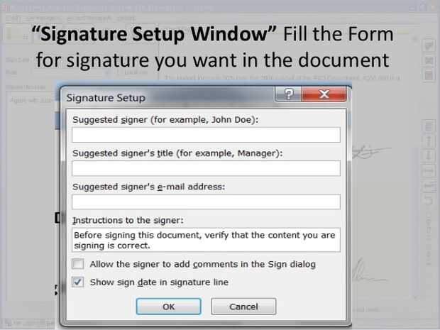 Paso 4: "Ventana de configuración de firma" rellene el formulario para la firma