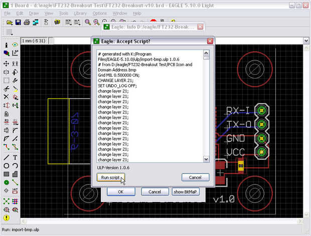 Este bmp.ulp de importación que se está ejecutando ha ido generando una secuencia de comandos. En este punto se puede ejecutar la secuencia de comandos para importar el mapa de bits en águila.