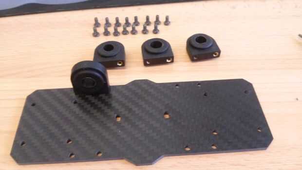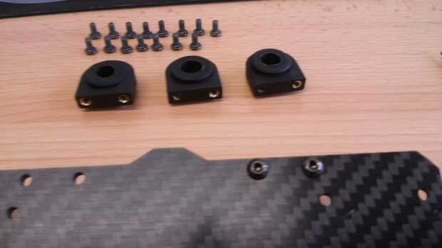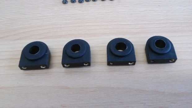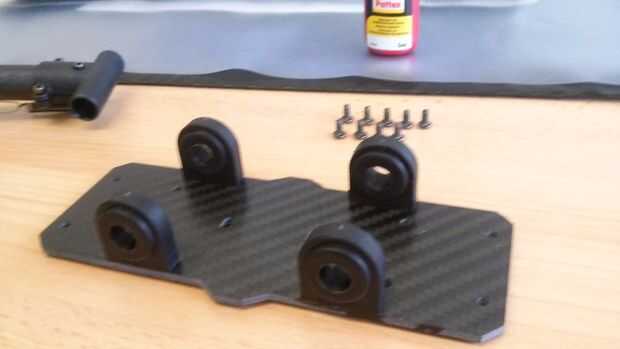 En primer lugar, instale los amortiguadores de caucho redondo en los soportes de montaje y tornillo de cada soporte en los orificios correspondientes de la placa de montaje. Hay 2 tornillos para cada soporte, ésos son los tornillos M3 estándar, por lo que no debe ser ningún problema. Obviamente tienes que instalar los soportes de cuatro en el mismo lado de la placa de montaje... Utilice una gota de pegamento de tornillo en cada tornillo, para asegurarse de que las vibraciones no aflojarla, causando pérdida del tren de aterrizaje mediados de vuelo, o peor...