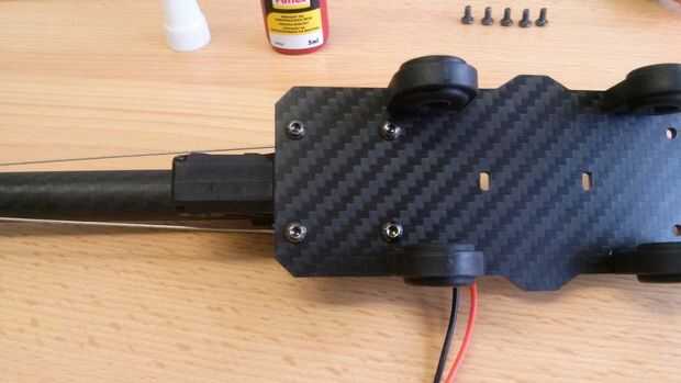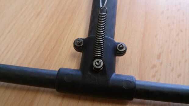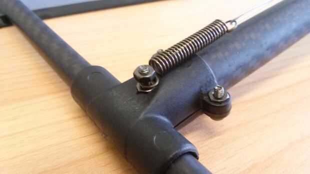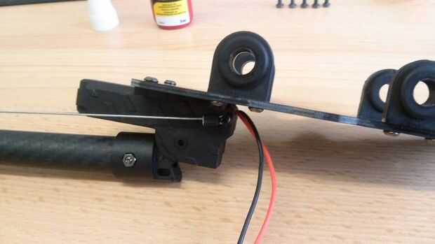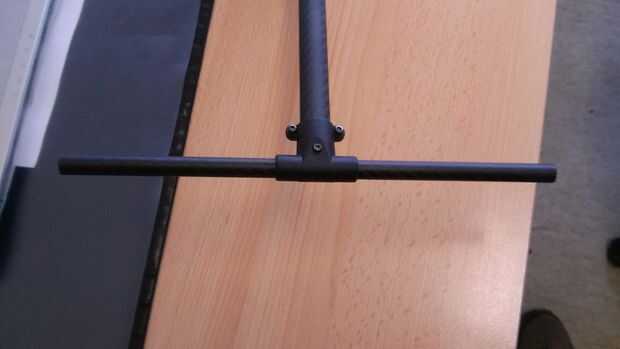A continuación están los patines de aterrizaje. Afloje los 3 tornillos en el soporte de T en el extremo de cada pata y coloque el tubo largo y fino de fibra de carbono dentro. Use una regla para encontrar el centro y apretar todos los tornillos. Es muy importante que el centro de los tubos, de lo contrario el zumbido no sentará a nivel y podría volcarse en despegue o durante el aterrizaje.