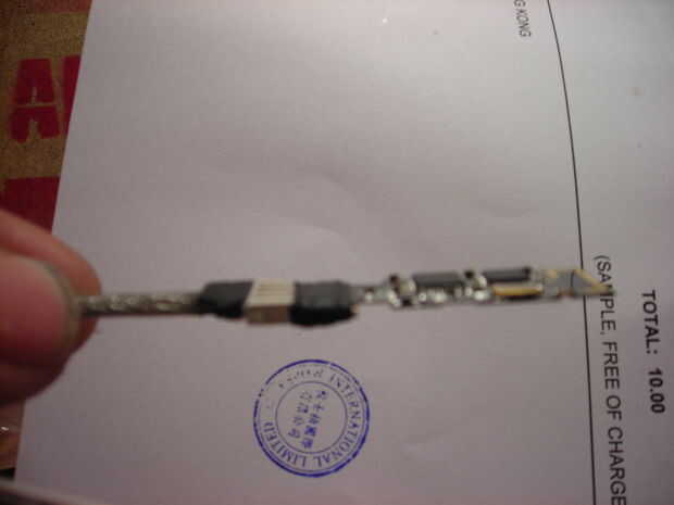 Ahora quité todo exceso forma material el dongle y el cable. La parte metálica de la clavija fue quitada y el plástico era lijar dejando un paso sólo lo suficientemente grande como para acomodar el usb de la llave (la llave tenía un espesor medio de usb) fue luego grabado junto con auto amalgamando cinta. También en esta etapa quitar exceso en el otro extremo (la parte que va en la computadora, pido disculpas por mi sombra terminología) y puse y ángulo en que traje mi computadora entonces pegado y había pegado.