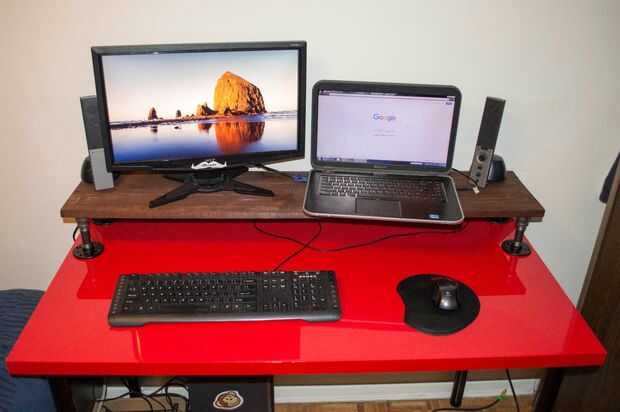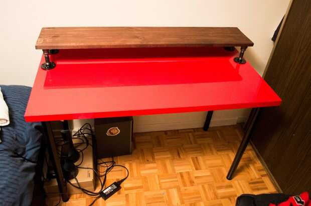 Aplique cinta de doble cara en ambos extremos de las piernas de la pipa y montar su nuevo escritorio. Ahora sujete o peso su estante en lugar en su escritorio y esperar para pasar la noche para alcanzar toda su fuerza.