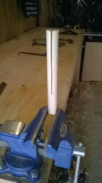 El primer paso es tomar la espiga y cortar en formas largo medio. No tiene que ser perfectamente por la mitad pero el más cercano es el mejor. Cuando hagas el corte, usted quiere tener sólo la parte inferior de la espiga en la prensa, si la sección está cortando es en la prensa, se pellizque la hoja de sierra. El corte debe ser aproximadamente 4" largo, dejando la parte inferior de la clavija conectada.