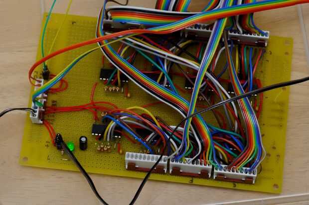 Usé conectores Molex porque los tenía a la mano y porque usted puede presionar los terminales Molex del conector si encuentra le cometió un error. Descubrí demasiado tarde en mi versión de protoboard que mis conectores Molex no eran realmente extremo-apilable. Tengo alrededor de él por doblar mis patas de la cabecera. En mi versión de cableado lo hice correctamente dándole un 0,1" agujero espacio entre cada conector.