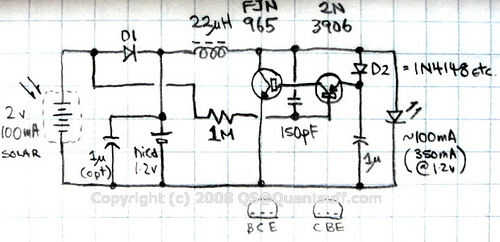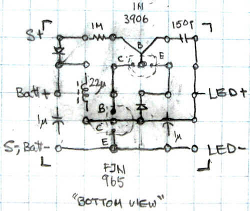 La verdadera estrella de este circuito es el transistor driver, FJN965 de Fairchild Semi. Capaz de manejar hasta 5 amperios de corriente en un caso de la a-92, comenzará en .9v y correr la luz hasta que la batería cae a debajo de 0,3 voltios. Usted puede conseguirlos de http://fairchildsemi.com