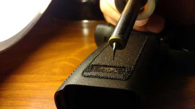 • Es importante sacar el polímero hacia arriba, si no resultará en un efecto de mancha en el punteado. He utilizado una luz moderada la presión con la punta más pequeña disponible en mi kit. Sujeta la plancha para ~1/2 segundo antes de mover a Asegúrese de que el plástico completamente derretido.