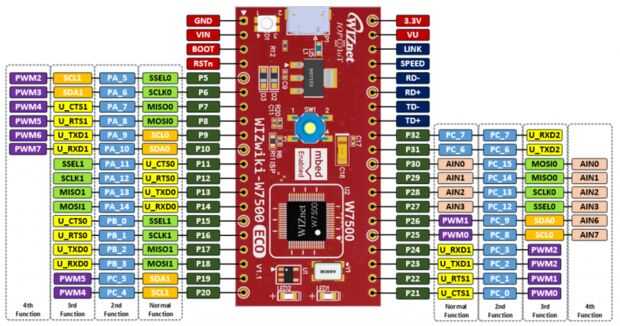 - WIZwiki-W7500ECO es una plataforma compacta basada en W7500, que es un SOC chip que integra un ARM Cortex-M0, 128KB Flash memoria y cableado TCP/IP base.