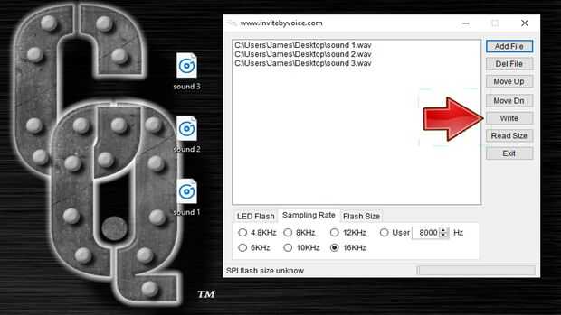 Ahora debe tener los sonidos seleccionados y la velocidad de muestreo establecido. Todo lo que queda es seleccionar el botón write y programará los sonidos que la tarjeta de sonido. Este es el último paso para añadir sonido a la Junta. Ahora salir y hacer algunas cosas interesantes que tienen sonido.