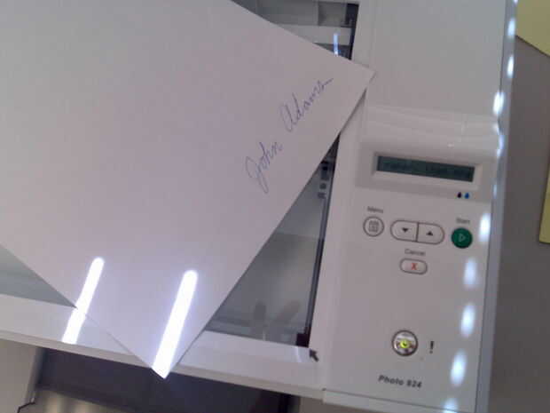 Necesita alguna forma de obtener esta firma en la computadora, un escáner óptico es probablemente su mejor apuesta, pero en circunstancias extremas, se podría utilizar una cámara digital.