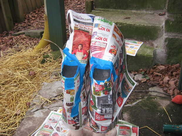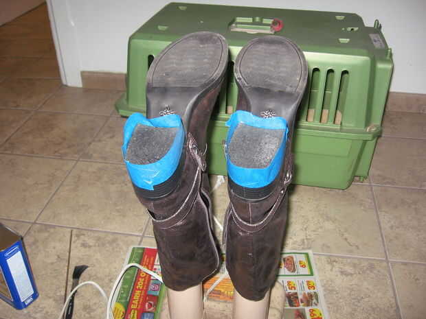 El siguiente paso es para enmascarar las zonas que no queremos a engomar. Después de todo no estamos tratando de hacer botas de lluvia, sólo queremos goma en los talones. Comencé usando cinta de pintor para hacer un perímetro alrededor de los talones. Asegúrese de que la cinta es como Lisa posible. Si la cinta es irregular, esto permitirá que el caucho correr en la cinta. Esto se cadenas goma feos y/o daños en el material de las botas. Con los talones con cinta use periódico para proteger el resto de las botas. Me aseguré que el libro cubre todas las partes de las botas y utiliza abundante cinta de enmascarar para mantener en su lugar y asegúrese de que las costuras eran selladas.