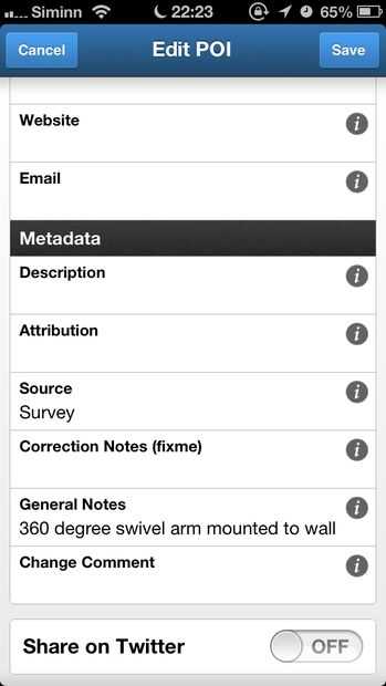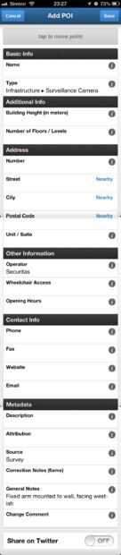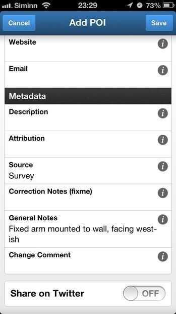En nuestro caso estamos agregando una cámara de seguridad y agregamos el operador (como es evidente por la etiqueta de la cámara) y aproximado de notas generales acerca de la cámara, tales como tipo, cómo se monta e información sobre qué dirección cardinal que se enfrenta (norte - oeste - Sur - Oriente) para distinguir entre las muchas cámaras adyacentes en esta ubicación. Estudiar la diferencia entre las dos cámaras diferentes en captura de pantalla 1 y 2 en este paso. Ellos están muy cercanas y podrían fácilmente ser confundidas si no marcados correctamente.