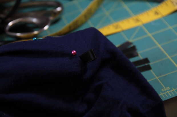 Veces cada uno de su 2" cinta piezas por la mitad, formando un bucle. Inserte cada pedazo de cinta en los agujeros que has recogido en las costuras. Los bordes de la cinta doblada deben alinearse con el interior borde de la costura del vestido; los lazos deben permanecer en el exterior. Prender desde el interior del vestido.