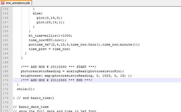 a continuación, tenemos que leer el valor de la fotorresistencia y llamar a la función de brillo para cambiar el brillo de la matriz de LED.  Se puede ver la función de 'mapa' utilizada para asignar el valor analógico a 0 - 15 valor esperado por el conductor HT1632.