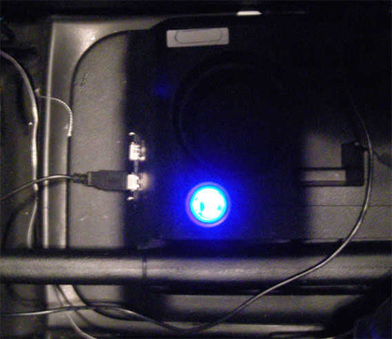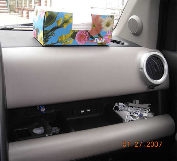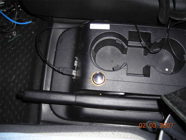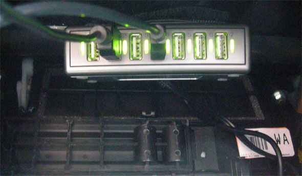 El segundo más importante elemento es puertos USB, más y más dispositivos necesitan energía del USB y todos los dispositivos "hablan" a la computadora por USB - así que añadido a un concentrador USB alimentado en mi guantera con 15' cable de USB a mi ordenador.