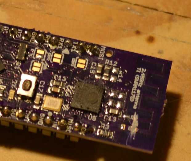 Desconecte la antena usando su Xacto rebanar a través de las conexiones de alimentación y tierra donde están las etiquetas 'RF' y 'Tierra' en el lado de la antena de la Junta, como se muestra en la foto de arriba. Asegúrese de que sus cortes pasan completamente por el cobre y separan. Generalmente hacen dos cortes paralelos muy juntos y raspe el cobre entre ellos para asegurarse de que verdaderamente he separado las dos partes.