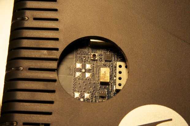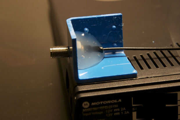 Ahora vas a encontrar una manera de asegurar la coleta en el módem para evitar haciendo hincapié en la conexión del adaptador a la Junta. Me corte la esquina de una caja eléctrica, taladrar un agujero lo suficientemente grande como para deslizar el conector SMA a través de y caliente todo lo pegan.