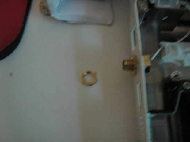 Hice lo anterior antes de colocar el conector permanentemente al caso. Pegué en y robó una pequeña arandela de mi router inalámbrico, para la soldadura en el exterior y fijar en su lugar (como veis no hay suficiente espacio para la tuerca a) - esto fue un poco incivilizado, ver si puede hacer un mejor trabajo por conseguir un conector más largo y una tuerca para mantenerlo en su lugar