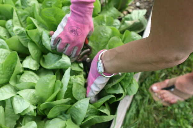 La lechuga no estaba totalmente crecido, pero decidimos cosechar un poco de la lechuga joven para mezclar con algunas lechugas más maduros que compramos en un mercado.