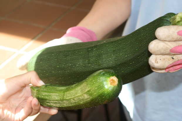 Cuando es el tamaño de un pepino o un poco más grande, es el momento de elegir. Debe ser un color verde más oscuro y no hay nada como el mutante, calabacín gigante que se muestra a continuación. Nos gusta absorber corte encima de calabacín en salsa de soja y entonces para dorar en una sartén a fuego lento. También se rellena con salchicha y otras carnes. Era delicioso. Por supuesto, comenzó a cansarse de todos los calabacines y comenzó a desear nuestras otras verduras comenzar a cultivar.