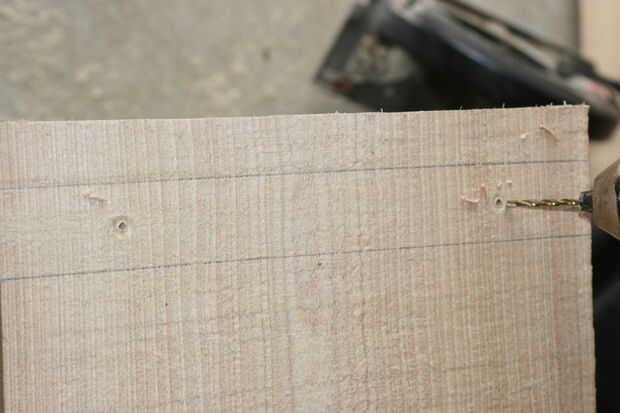 A partir de los pedazos de extremo de 4 pies, marca una línea de 1 pulgada. pulg y luego traza la otra línea con el juego. Ahora perfore dos agujeros en el exterior, cerca de la parte superior e inferior de esta pieza. Estos serán los agujeros para tornillos de sus cuando se conecta este pedazo de madera a la hoguera. Lo mismo al otro lado.