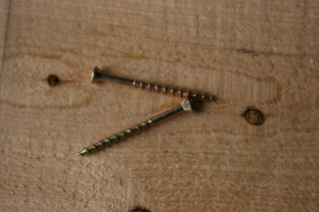 Ahora encontrar su pies 12 piezas de Chipre. Como se muestra en la imagen 10, esta pieza se colocará en el exterior de la estaca, pero en el interior de la pieza final. Tome dos tornillos más y conecte esta pieza a la tabla. Asegúrese de que sus tornillos estén en un lugar diferente de los tornillos de la pieza final, porque no quiere que chocan.