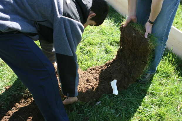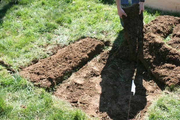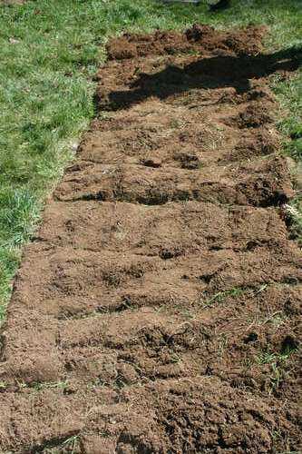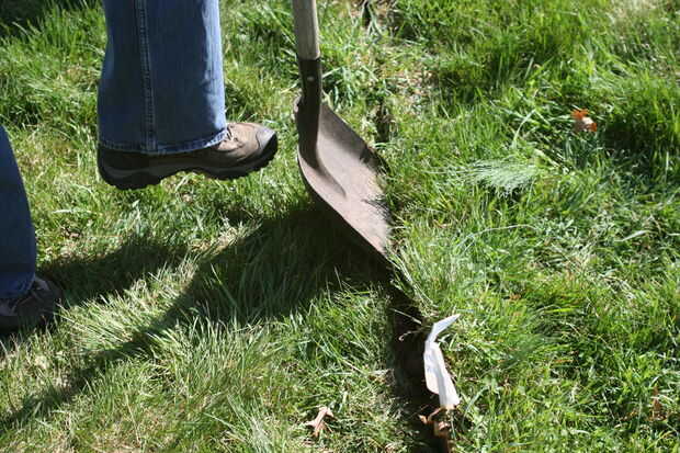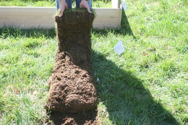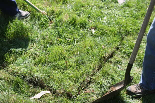 Así que comienza por tomar una bordeadora y un borde alrededor de la parcela y borde entonces las secciones de la parcela. Esto permite a la pala entrar más fácil y separar la suciedad y todo. Toma tu pala, empujar en los bordes y levante. Ahora podrás agarrar el suelo y levante hacia arriba. Ahora a colocarlo en la misma posición como estaba; excepto que esta vez se enfrentarán la hierba hacia abajo con la suciedad hacia arriba.